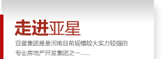 未來,亞星集團將以現(xiàn)代企業(yè)管理理念、標準化的工作流程、規(guī)范化的管理運作,不斷提升公司實力;以領(lǐng)跑中原地產(chǎn)行業(yè)的發(fā)展為目標,精益求精,不斷超越,與時俱進!